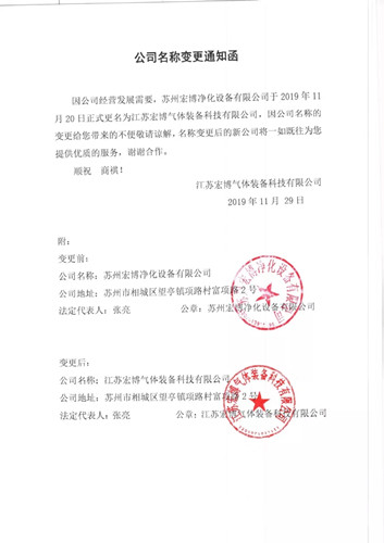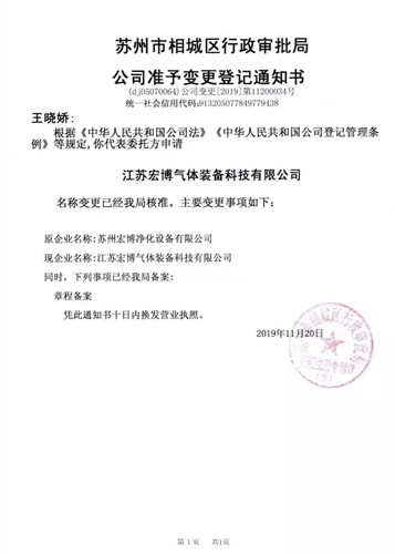 为适应市场经营和公司发展需要,2019年11月20日,经苏州市相城区行政审批局核准,原“苏州宏博净化设备有限公司”正式变更登记为“江苏宏博气体装备科技有限公司”。
