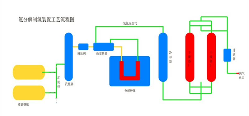 液氨经氨减压阀减压,进入水汽化器,然后进入热交换器和氨分解出来的氢气进行热量交换,进入分解炉体里,分解成氢氮混合气,出来的热气体和氨进行热量交换,再进入水冷却器冷却后,即可送到使用点。